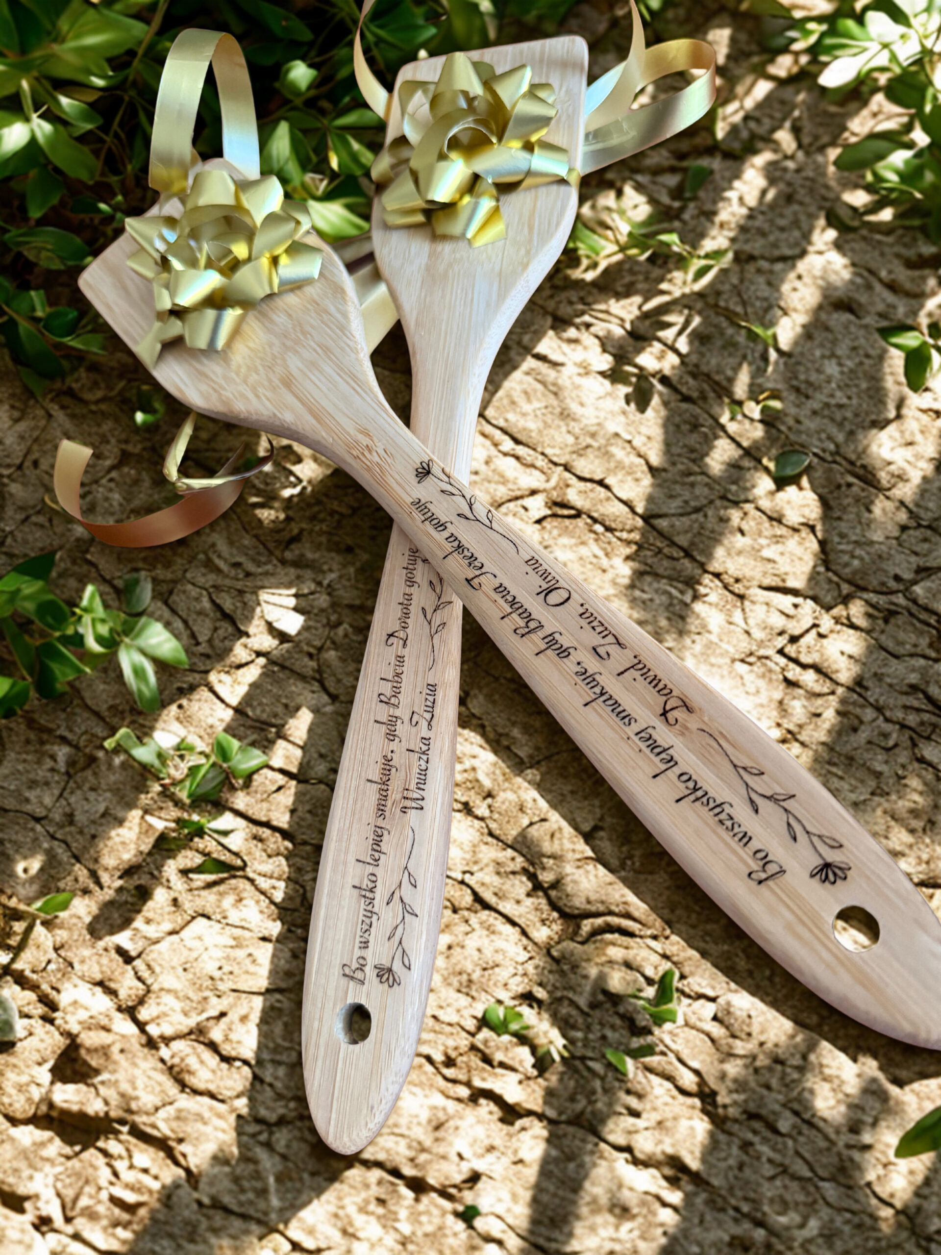 Największą ozdobą produktu jest delikatny, personalizowany grawer z imionami oraz dekoracyjnym motywem roślinnym. Dzięki temu łopatka staje się nie tylko praktycznym akcesorium kuchennym, ale również piękną pamiątką na lata.
