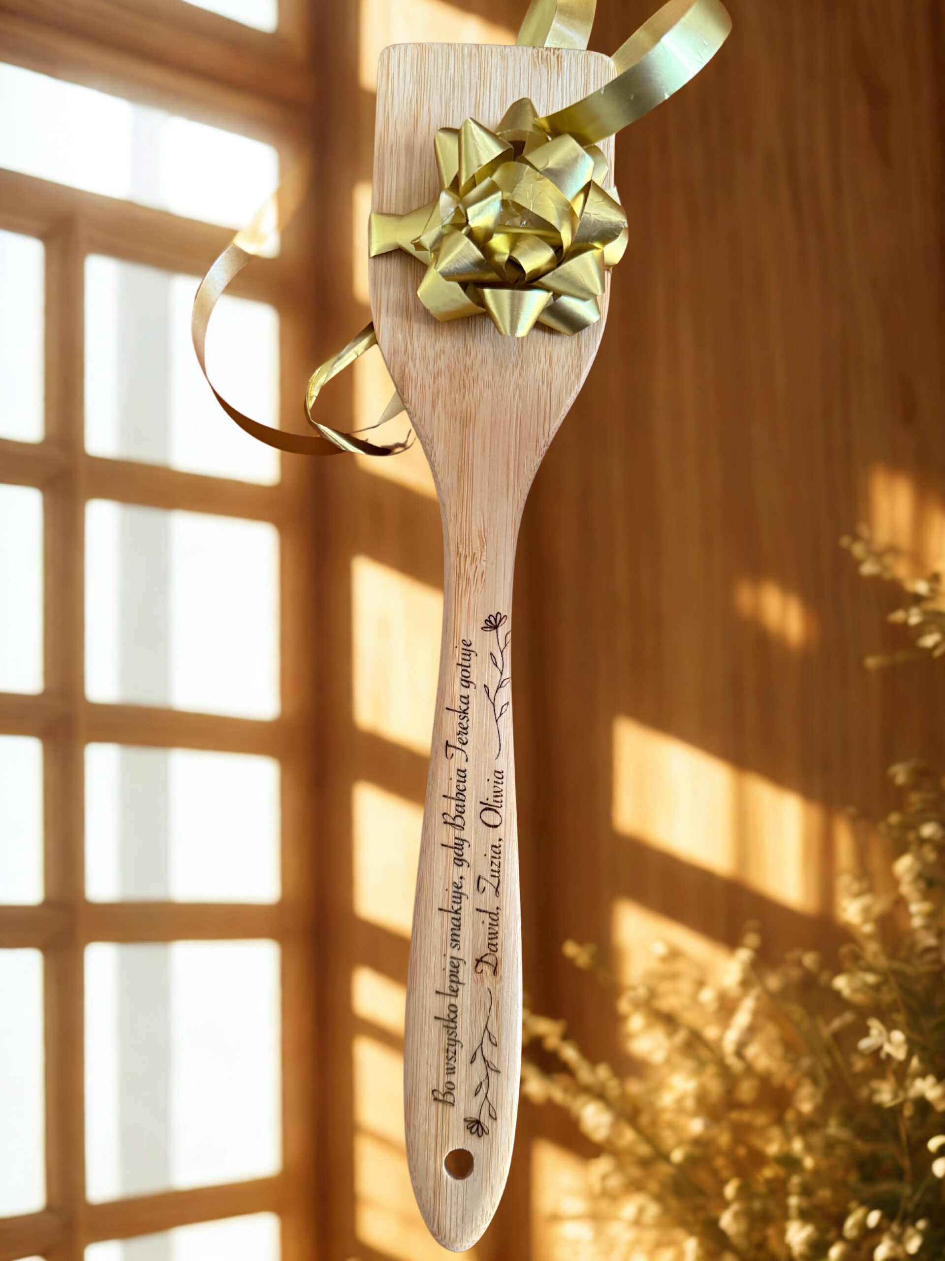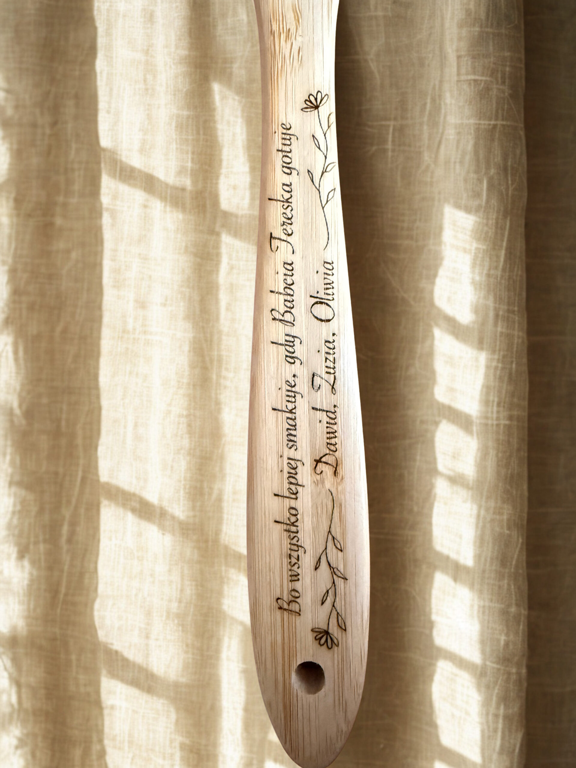 Drewniana łopatka kuchenna z personalizowanym grawerem to wyjątkowy i praktyczny prezent, który doskonale sprawdzi się na wiele okazji. Wykonana z naturalnego drewna, jest trwała, bezpieczna dla naczyń oraz wygodna w codziennym użytkow